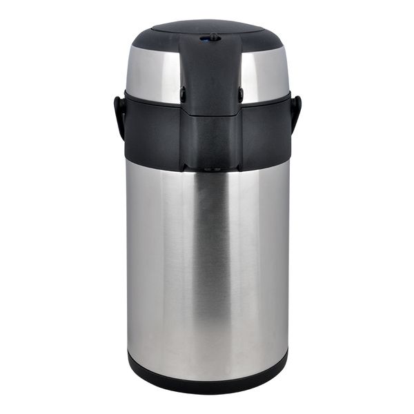 Easy-to-use push button pump dispenser with unbreakable stainless steel interior and exterior.